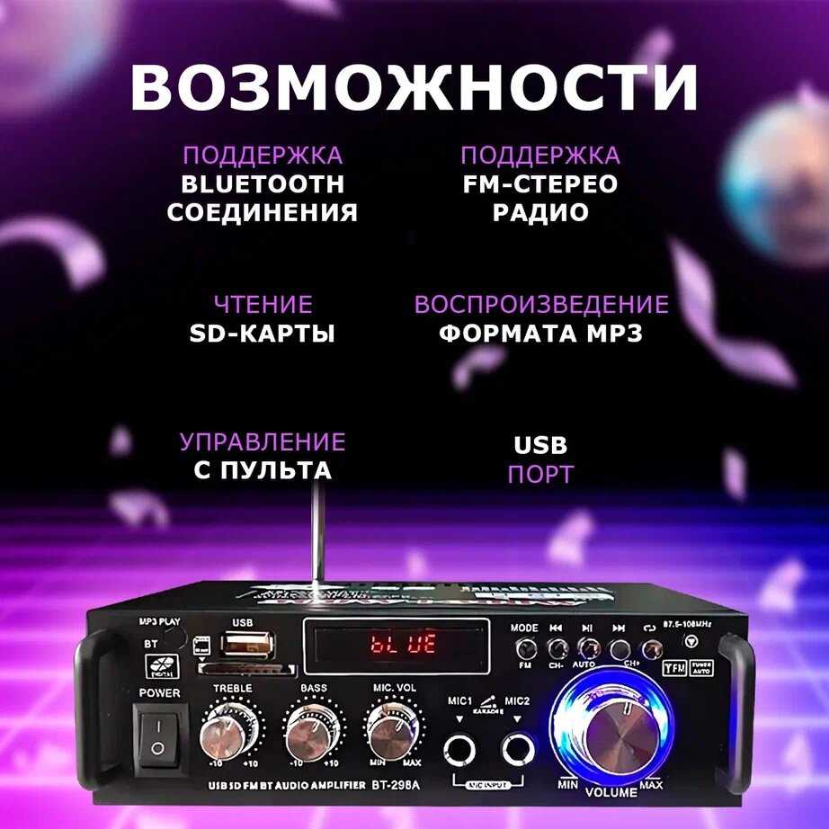 - + Мигают огоньки на передней панеле. Подключили к колонкам. Звук регулируется. Звучание громкое. Пульт работает