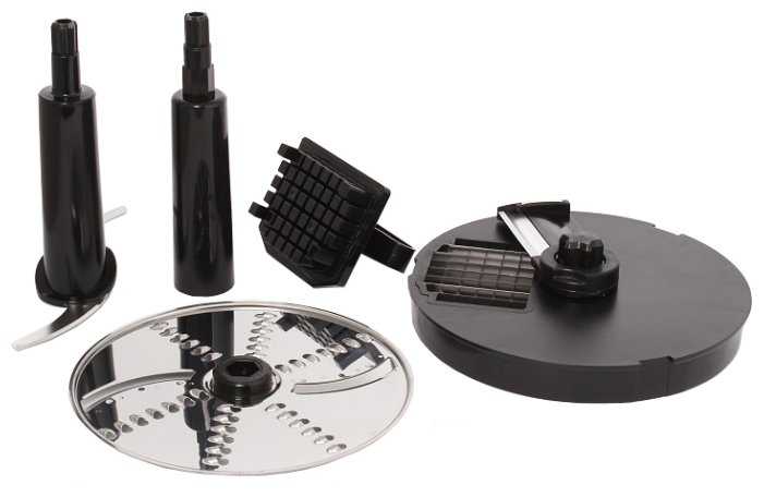 Насадки : | венчик для взбивания, диск для нарезки ломтиками, для нарезки кубиками, для приготовления пюре, измельчитель, насадка для шинковки, терка |