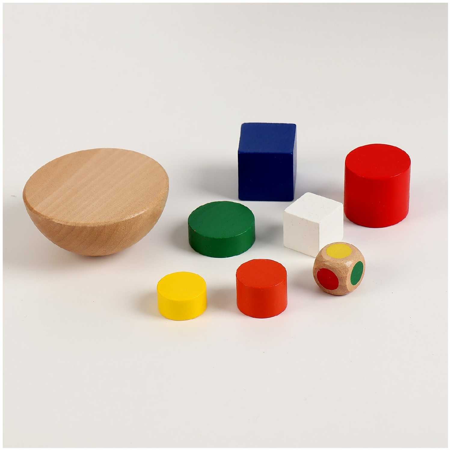 Полусфера покрыта лаком, скользкая. Кубики и цилиндры яркие, тоже хорошего качества, скользкие. В комплекте мешочек и правила игры вкратце.