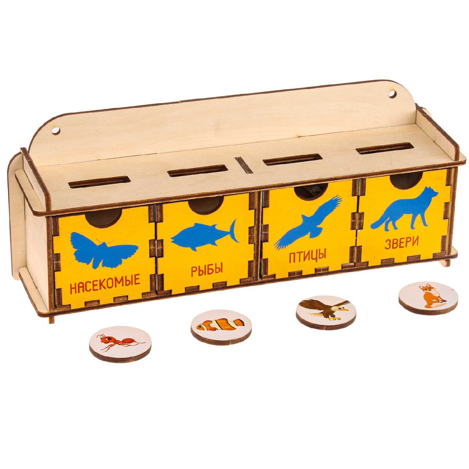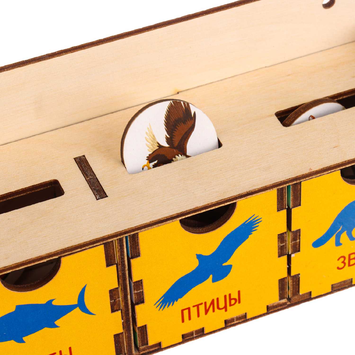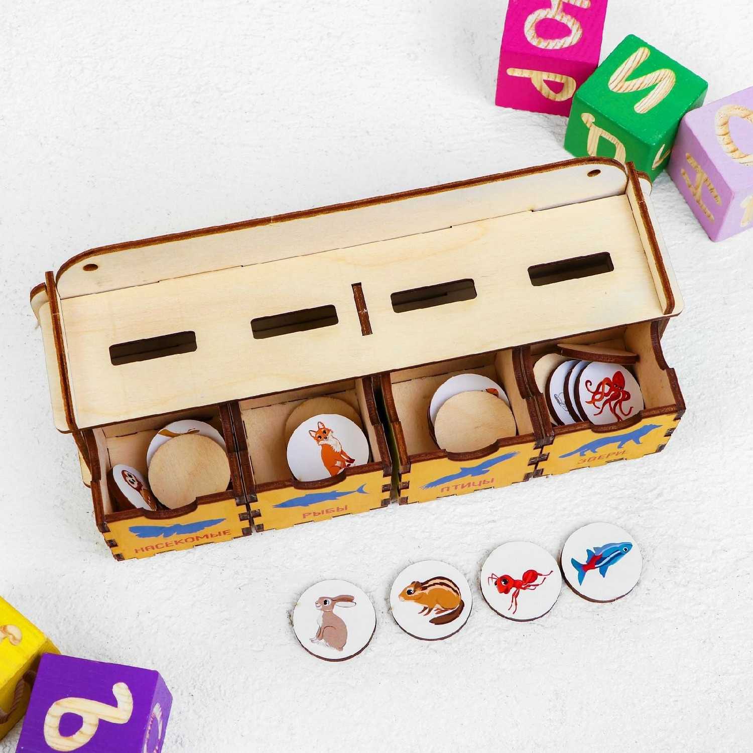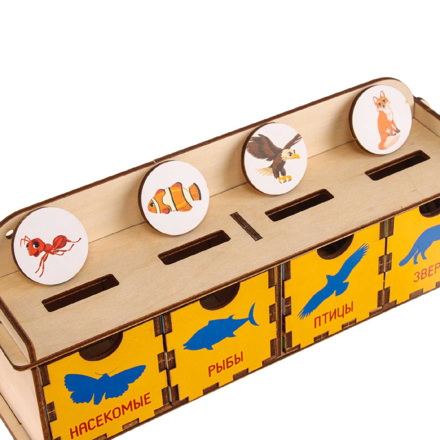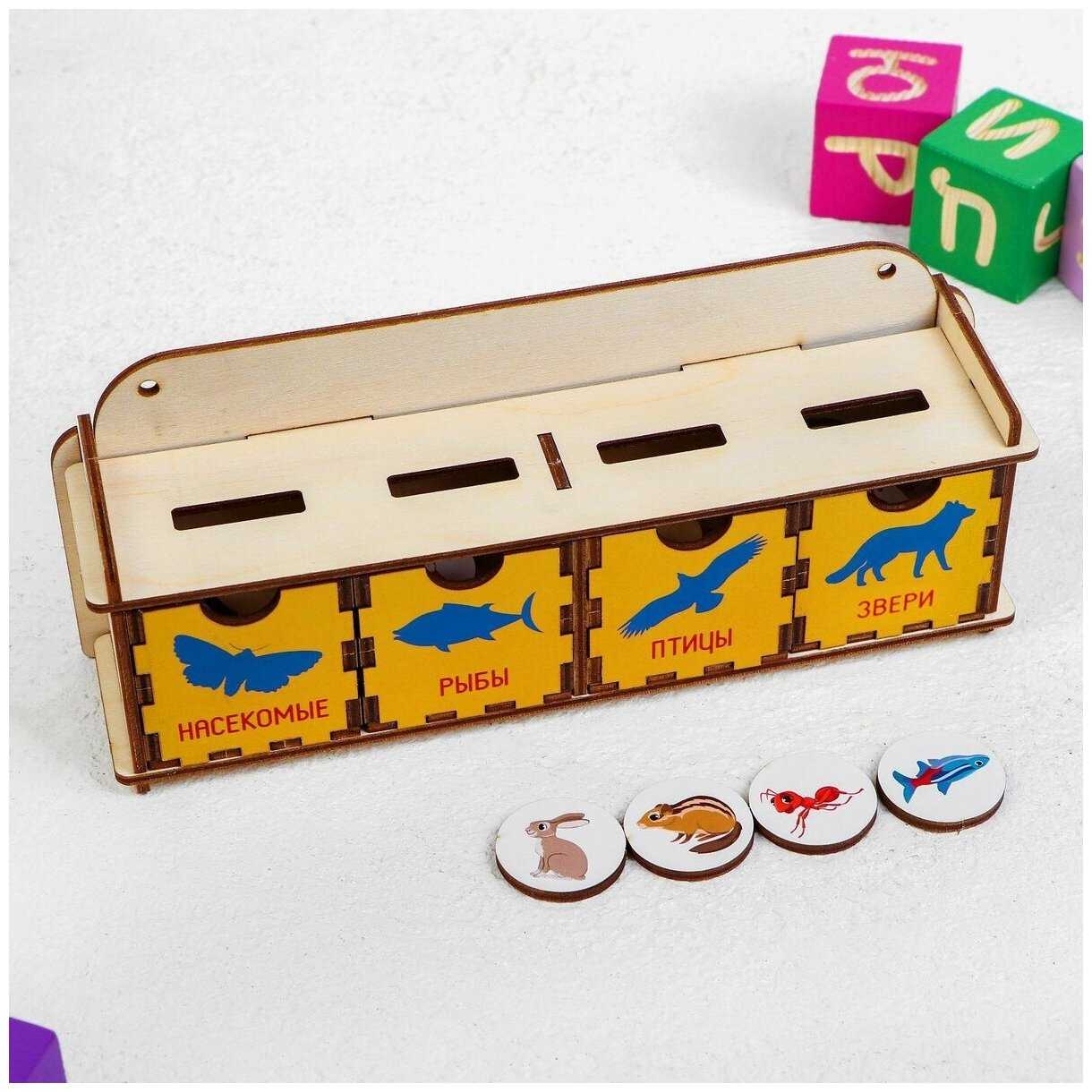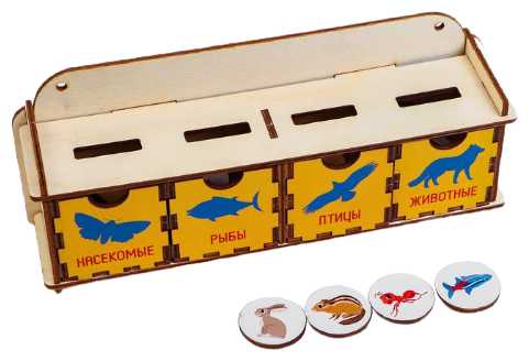- - фишки с большим усилием, а некоторые вообще не входят в прорезь, ребенок один точно не справится. Не очень понятно как на группы делить фишки, например лесных животных уже полный контейнер, а морских обитателей не знаешь куда положить
