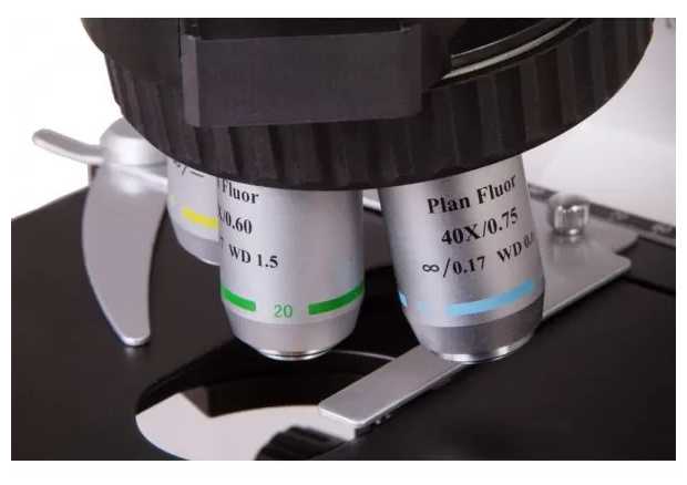 - объективы: бесконечные планахроматические люминесцентные (флуоресцентные) объективы: 4х