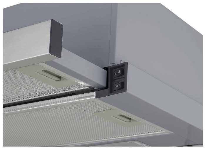 - + Очень удобно, что для включения вытяжки и света, нужно просто выдвинуть часть на себя. Так же мне понравилось что кнопки внутри и там несколько позиций и у света и у силы вытяжки. Очень мощный, рядом даже прохладно стоять.