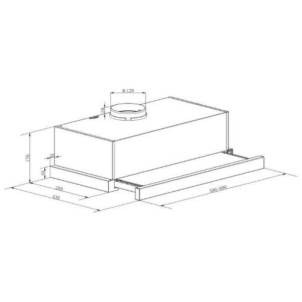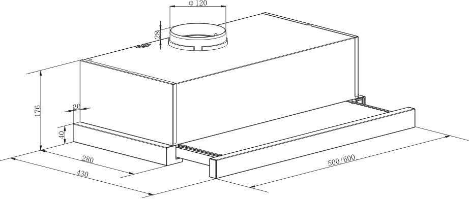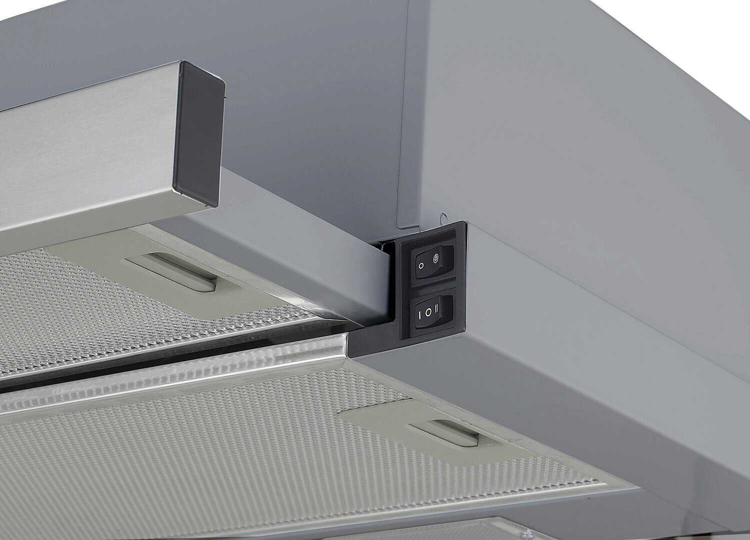 Брал вытяжку шириной 500 мм. Подошла к шкафчику такой же ширины очень точно. При складывании выдвижного лотка отключается подсветка и вентилятор, можно не выключать кнопки.