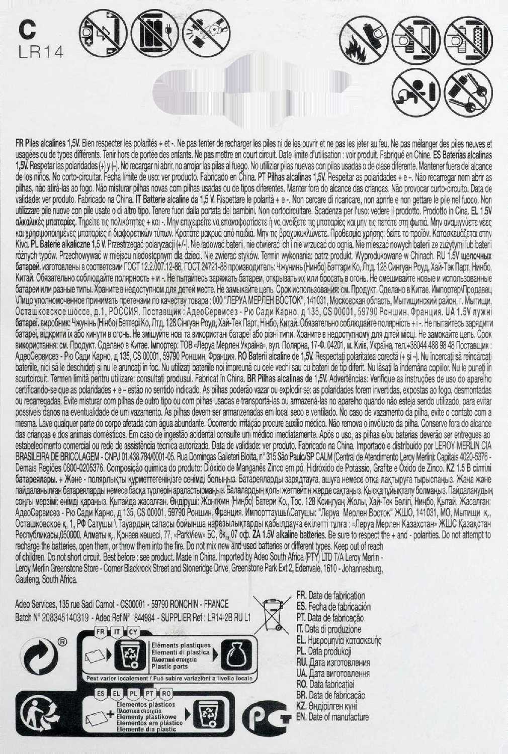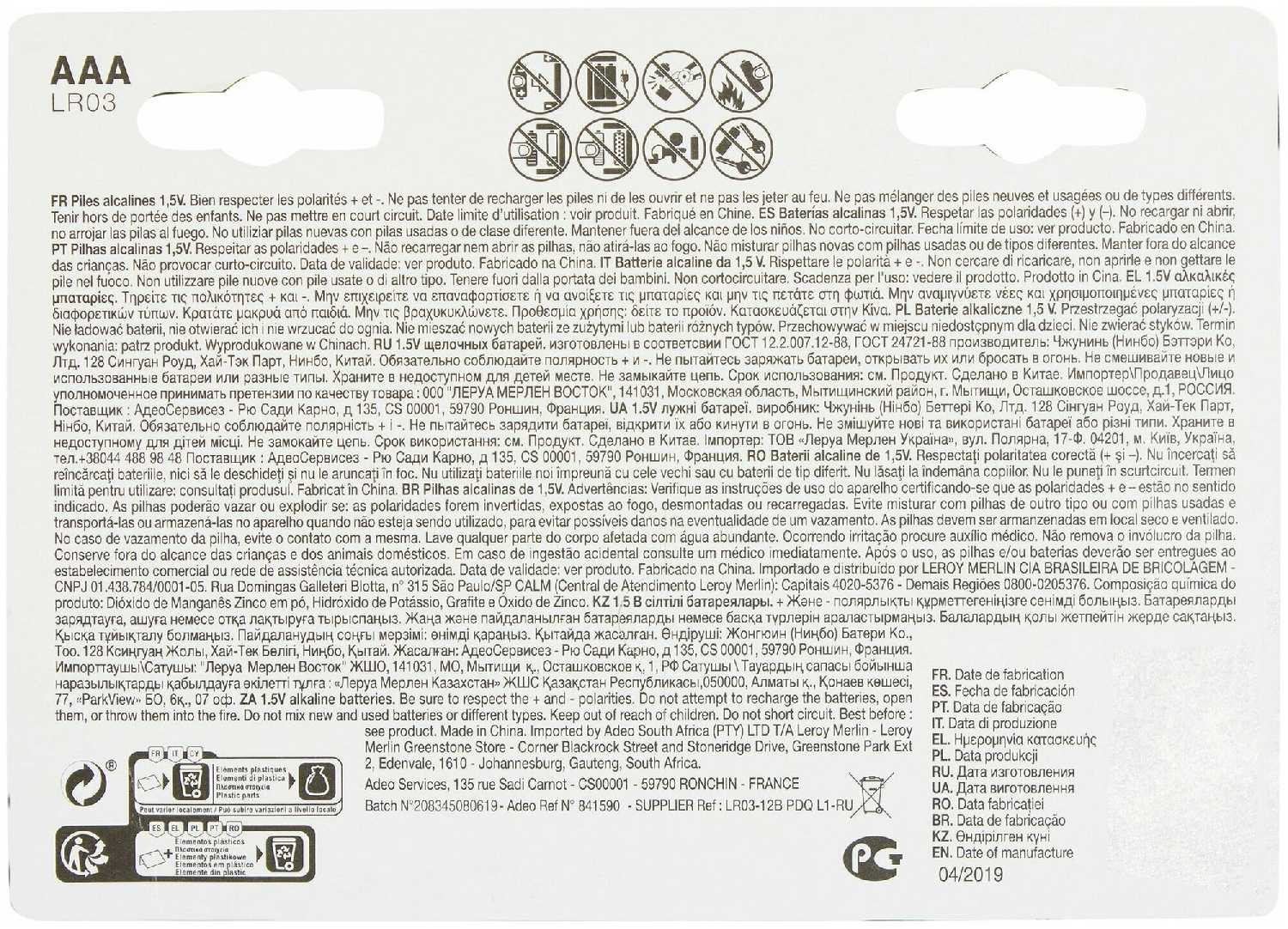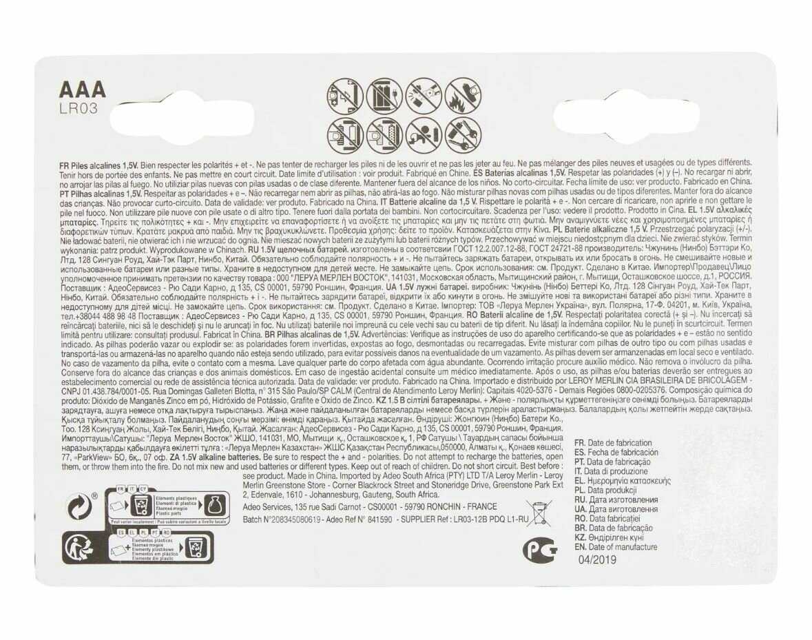 Типоразмер : | 1/2AA (R14250), A, A23 (3LR50, MN21, K23A, LRV08, LRV8), AA (R6, LR6, FR6, HR6, ZR6), AAA (R03, LR03, FR03, HR03, ZR03, MN2400), C, CR2025, CR2032 (5004LC), D, LR60 (LR621, AG1, G1), Крона (6LR61, 6LF22, 6KR61, 1604A) |