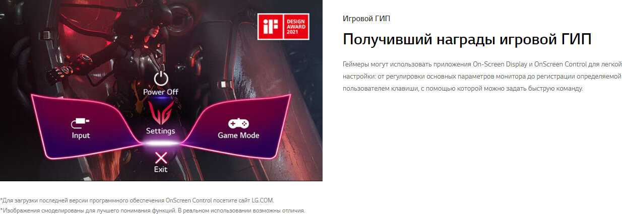 Джойстиковая система навигации под экраном признана интуитивной: переключение между профилями («Игрок 1», «Игрок 2») занимает секунды. Пользователи настраивают параметры за 30–40 минут, хваля гибкость режимов отклика и цветовых температур. Недостаток — отсутствие кнопки быстрого закрытия меню: оно исчезает автоматически через 20–35 секунд. Для тонкой калибровки доступно ПО OnScreen Control от LG. -