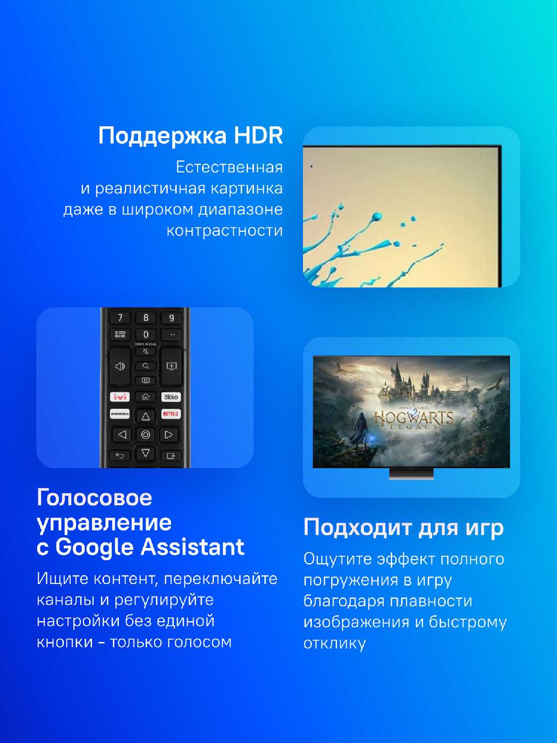 Четкая отличная картинка, хороший звук, чёрный цвет на VA матрице отличный, много настроек для настройки изображения под себя! Смотреть фильмы в HDR, Dolby Vision качестве, одно наслаждение