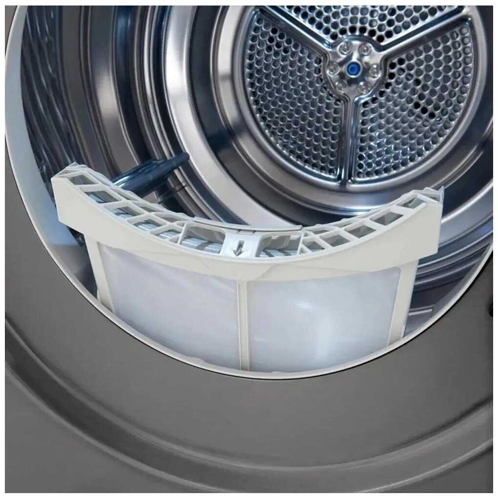 - Тепловой насос и инверторный двигатель обеспечивают нагрев до 55–65°C, что позволяет быстро высушивать даже объемные вещи (пуховики, одеяла) без пересушивания.