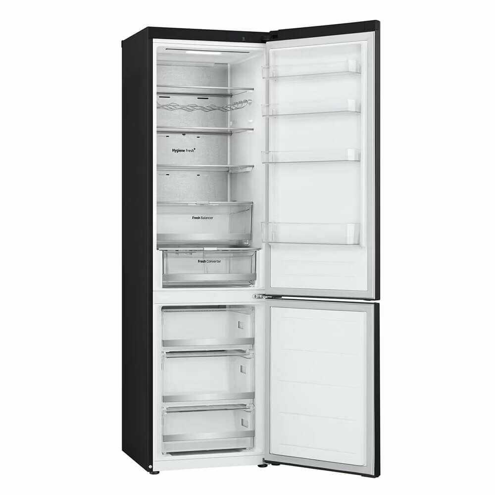 Модель большая, с широкими полками на дверях и в корпусе, позволяет хранить много продуктов для 3-4 человек, включая крупные кастрюли при складывании полки. Ящики под овощи и мясо объёмные, а зоны свежести оптимизируют пространство. Минус — винная полка снижает полезный объём, если не адаптировать, но общая вместимость выше, чем в предыдущих LG или Beko. Пользователи хвалят за удобство в кухне-гостиной, где места ограничено. -