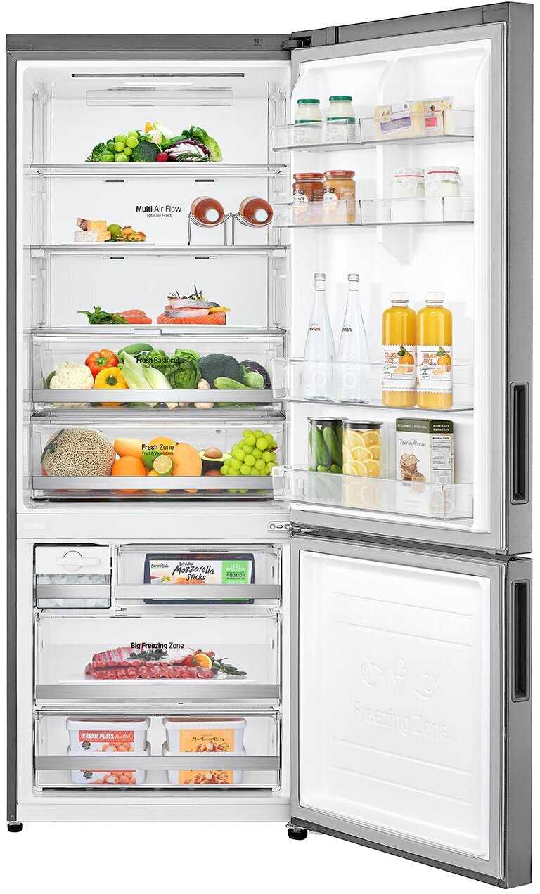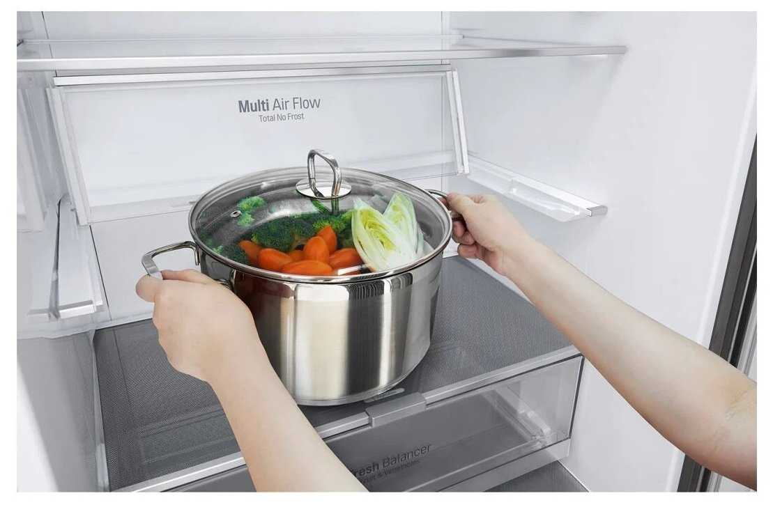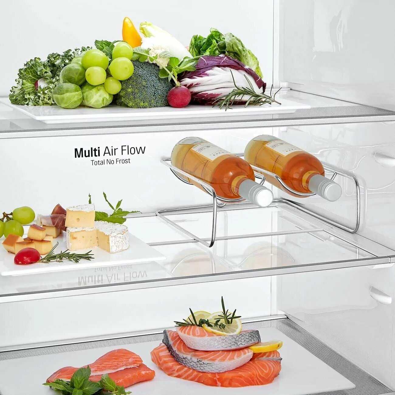 Складывающаяся (точнее, сдвижная) полка в холодильнике — ключевое конкурентное преимущество, позволяющее размещать высокие предметы (кастрюли до 20 см, трехлитровые банки) без демонтажа всей конструкции. Однако её реализация имеет недостатки: при сдвиге полезная площадь сокращается вдвое, а сама полка воспринимается некоторыми пользователями как ненадёжная из-за видимого прогиба под нагрузкой. Глубокие полки на дверце (особенно нижняя, начинающаяся у самого низа) эффективно вмещают крупные бутылки до 2 л и соусы, но балконы вообще не регулируются по высоте. Для полного извлечения овощных ящиков или нижних полок требуется открывание двери минимум на 115 градусов, что критично при установке вплотную к стене. Объём формально большой, но нерациональное зонирование (негибкие полки, массивные балконы) ограничивает его практическое использование.