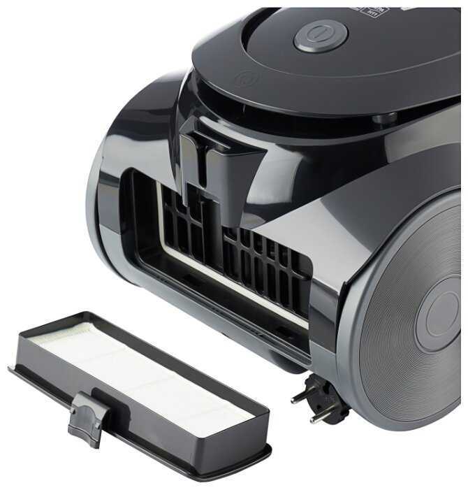 - + Хороший, мощный пылесос. Убирает самый мелкий мусор. Очень нравится, контейнер который очень просто отстегивается, удаляется с него мусор и моется.