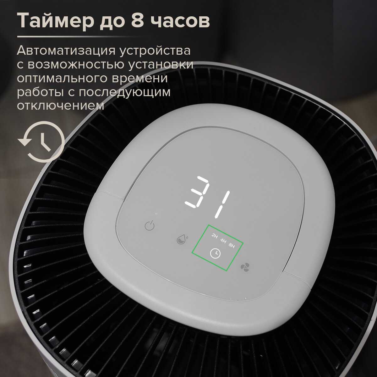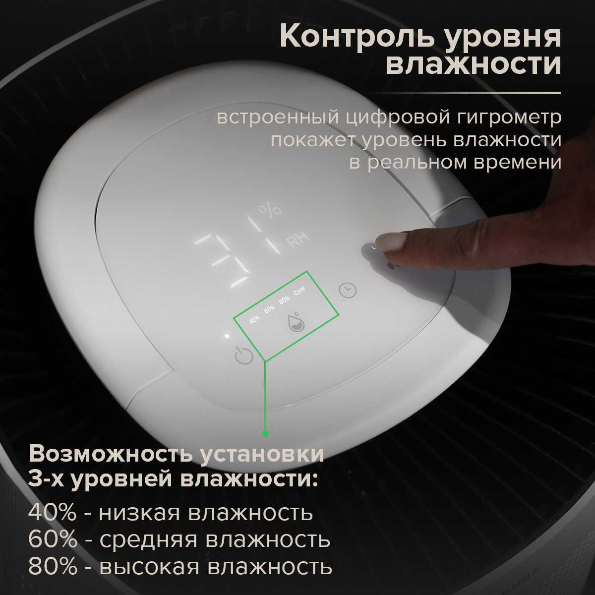 Особенности : | встроенный гигрометр, встроенный гигростат, дисплей, ручка для переноски, сенсорное управление |