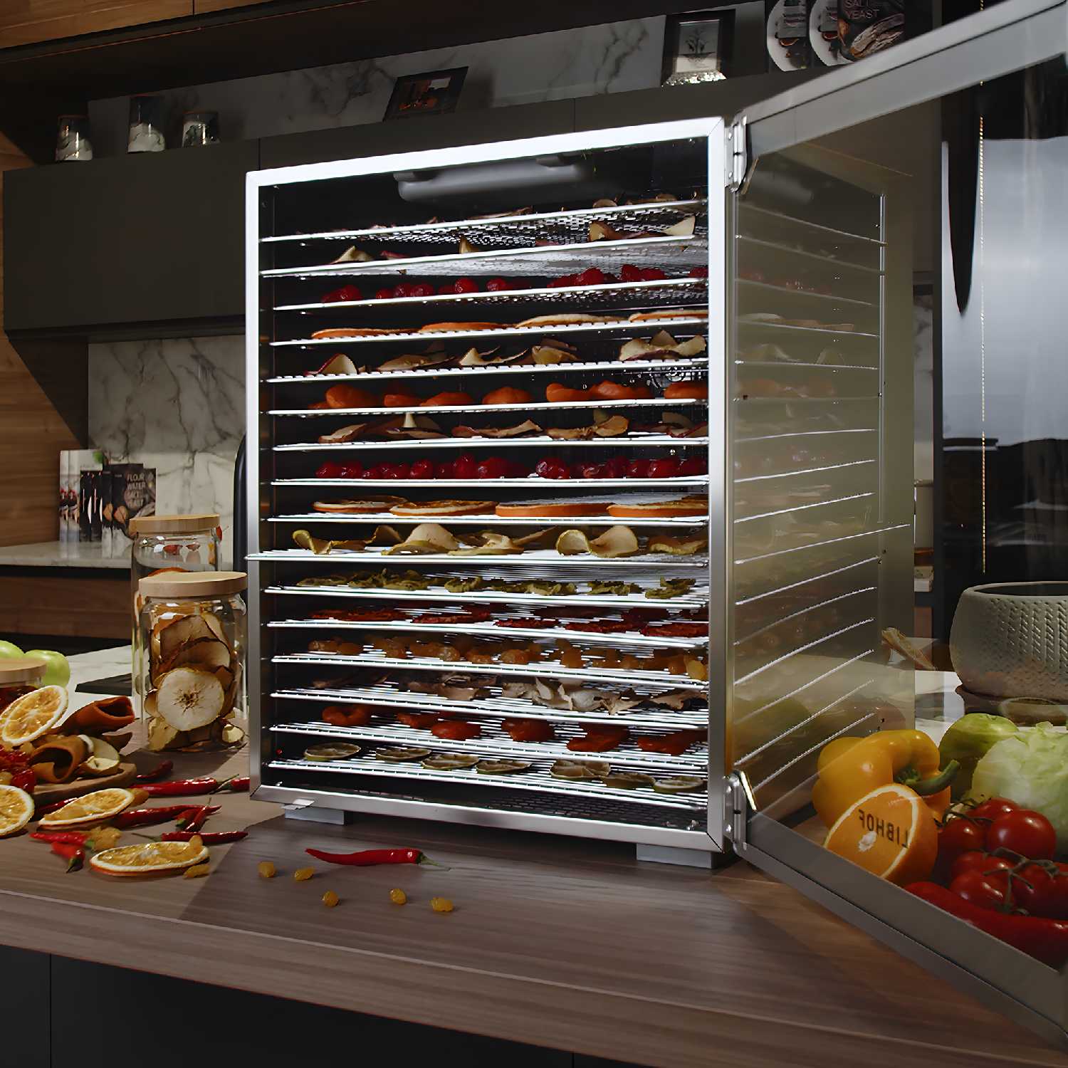 - + 16 поддонов. Большая и вместительная. Отлично сушит колбаски, джерки, овощи, фрукты ягоды. Есть таймер. Подсказка по температуре сушки продуктов рядом с кнопками управления