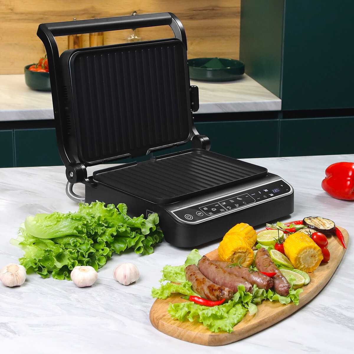 гриль со своими обязанностями справляется, котлеты для бургера-пожалуйста, стейки-пожалуйста! курица, мясо, овощи, колбаски, сосиски всё без проблем. панели моются без проблем