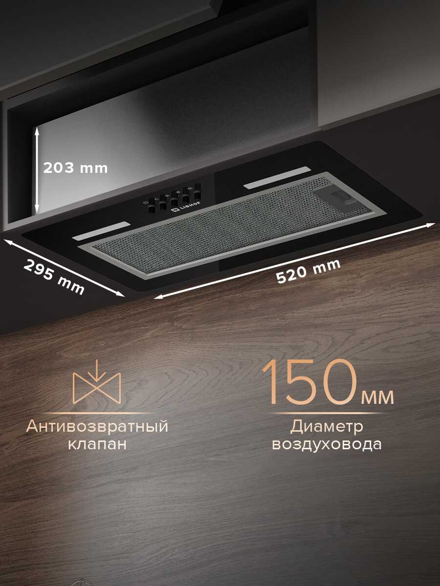 Вытяжка соответствует полностью прям своим размерам и встала четко. Хорошая стоимость, современный дизайн. Выглядит и правда отлично, ничего нет лишнего. Шума особого нет. Подсветка достаточно яркая, ее хватает. Рекомендую.