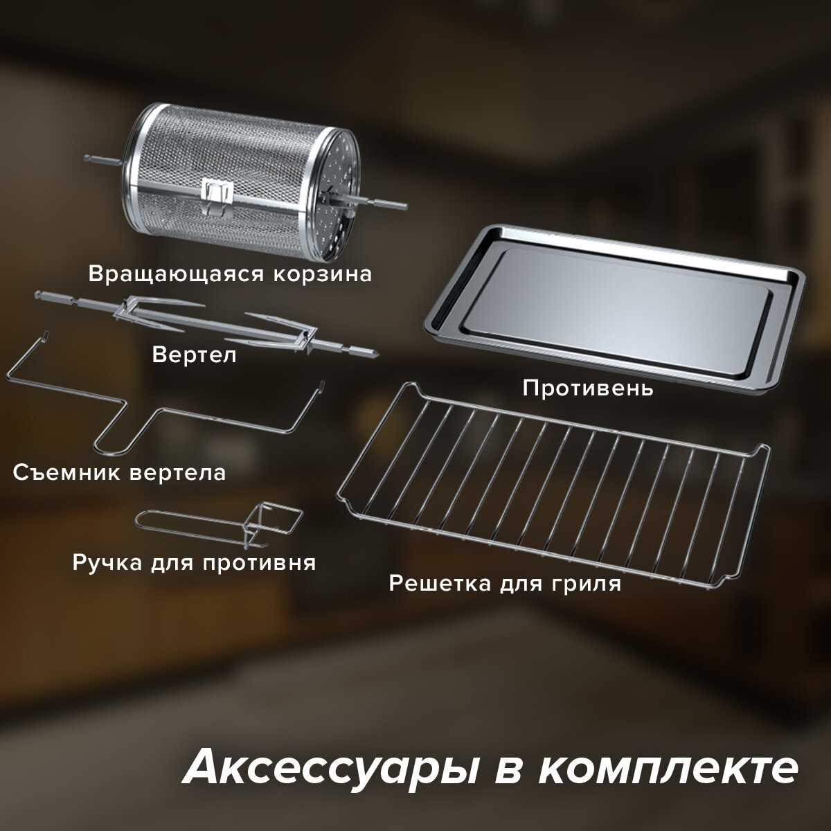 В комплект входят решетка, противень, вертел для гриля, корзина для фритюра и книга рецептов с проверенными блюдами. Пользователи ценят эти аксессуары, так как они расширяют возможности, позволяя жарить без масла или готовить шашлык. Поддон для крошек и жира упрощает уход. Однако некоторые отмечают, что противень и решетка иногда меньшего размера или с дефектами, выскальзующими из пазов. В целом, комплектация достаточная для старта экспериментов на кухне. -