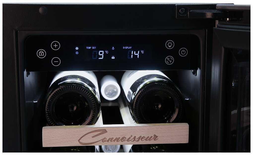 - + Тихая работа компрессора, всего 40 дБ. Полки из массива бука. Удобное сенсорное управление с возможность регулировать температуру от 5 до 20 градусов.