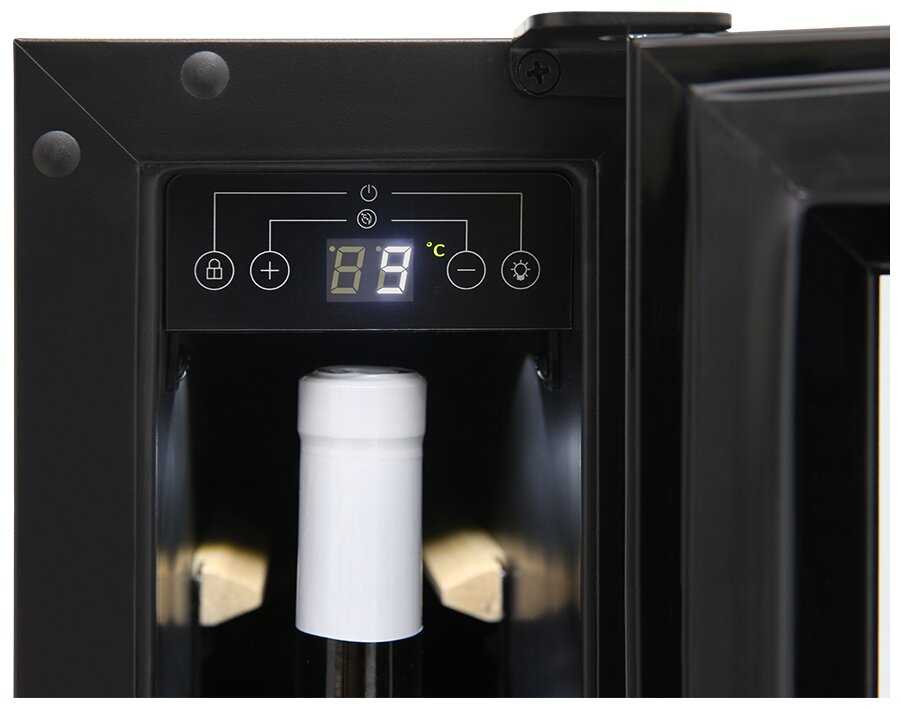 Отличный холодильник на 9 бутылок, тихий и хорошо вписывается в кухонный гарнитур. Из минусов — широкие бутылки не помещаются, но хорошо входят классические и бутылки рислинга. Бутылки белого входят только вертикально