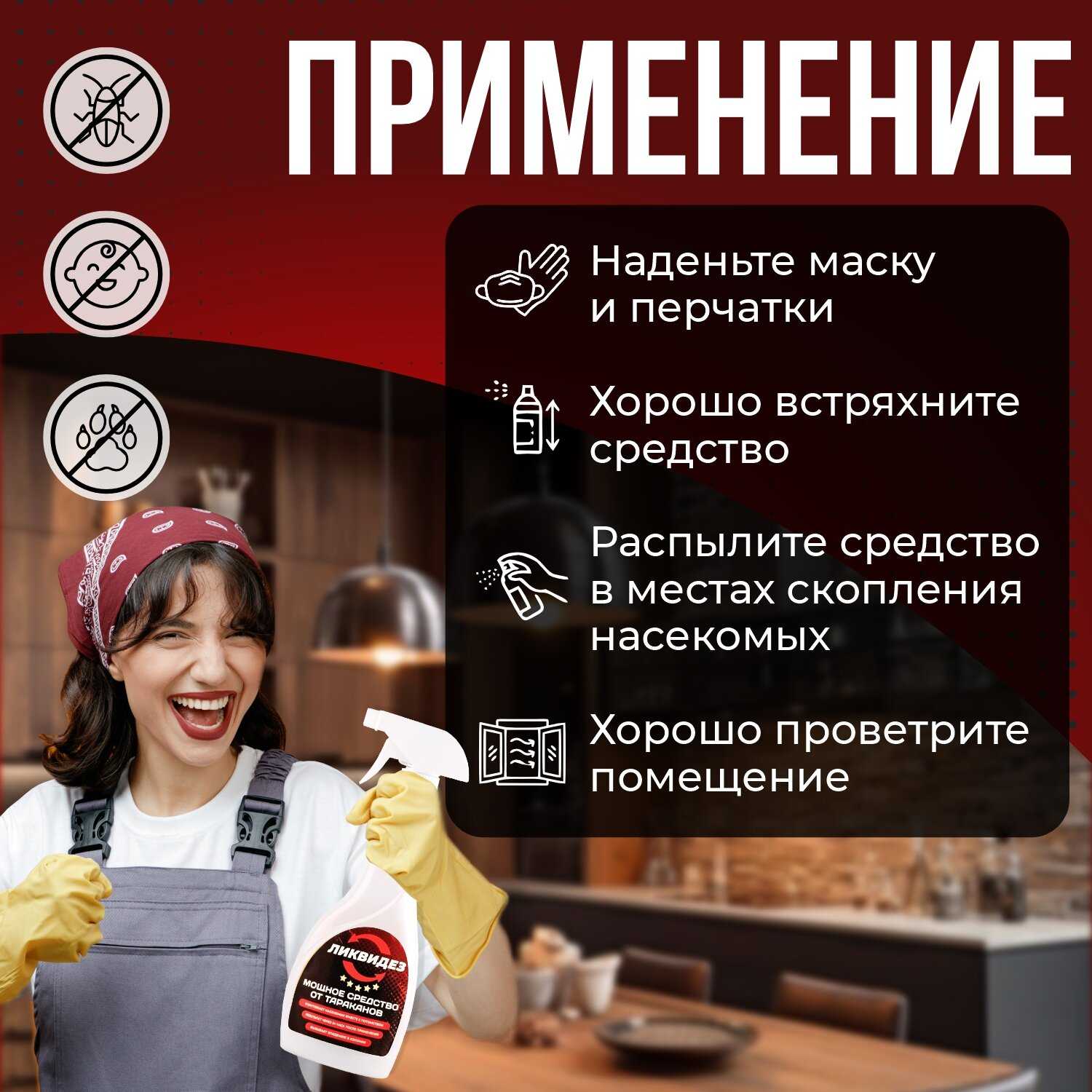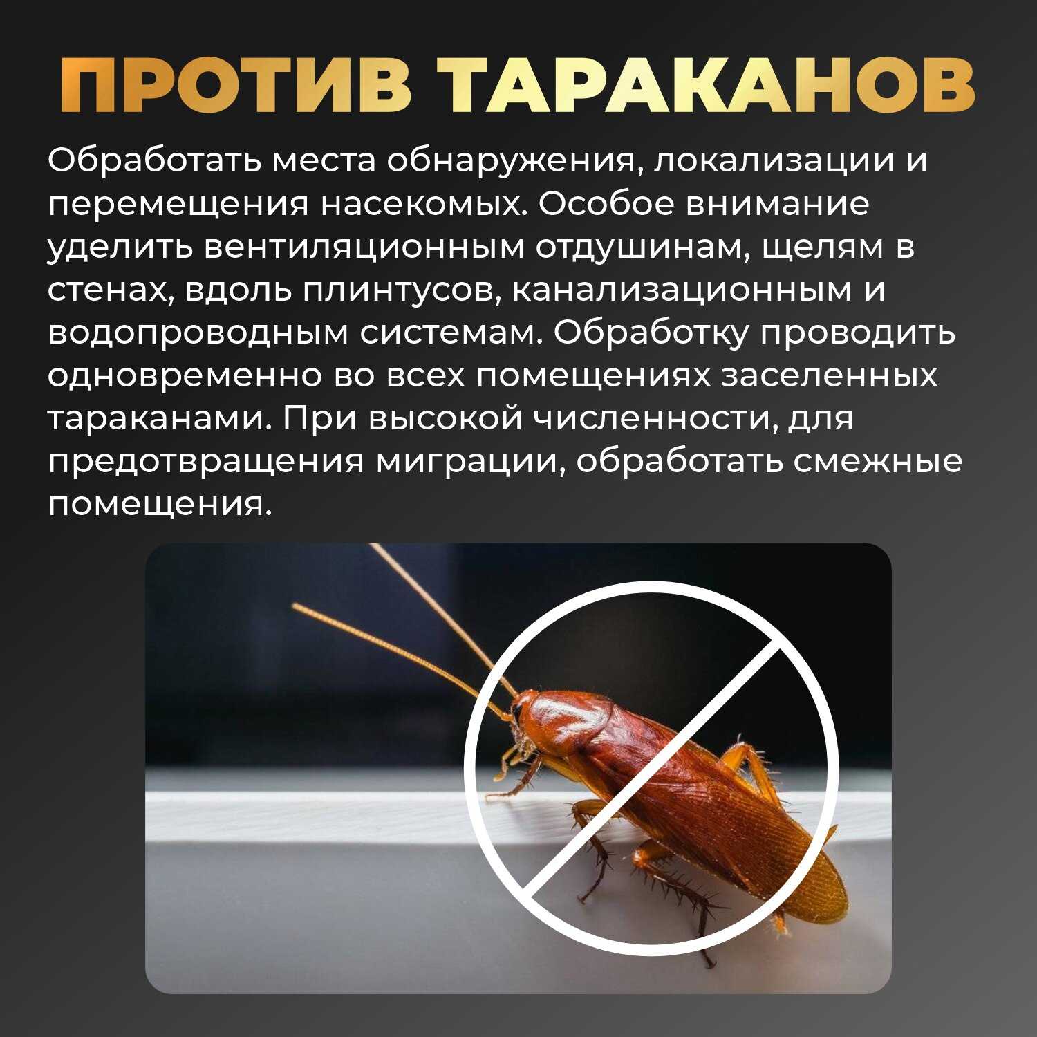 Способ применения : | Для эффективного избавления от тараканов следуйте инструкции: 1. Удалите источник пищи и воды. 2. Обеспечьте чистоту. Проведите генеральную уборку. 3. Создайте барьеры, чтобы тараканы не могли пролезть через щели и трещины. 4. Встряхните спрей. Тщательно обработайте места обитания тараканов средством Ликвидез, наносят на предметы обстановки, в местах обитания тараканов и на путях их передвижения к воде и пище на расстоянии 15-20 см. 5. Спустя 1-1, 5 часа проветрите помещение и проведите влажную уборку. 6. При необходимости повторите обработку от тараканов. Но помните, что лучший эффект будет достигнут при комплексном подходе, который кроме использования средств включает в себя устранение источников питания, регулярную уборку и барьерную защиту. |