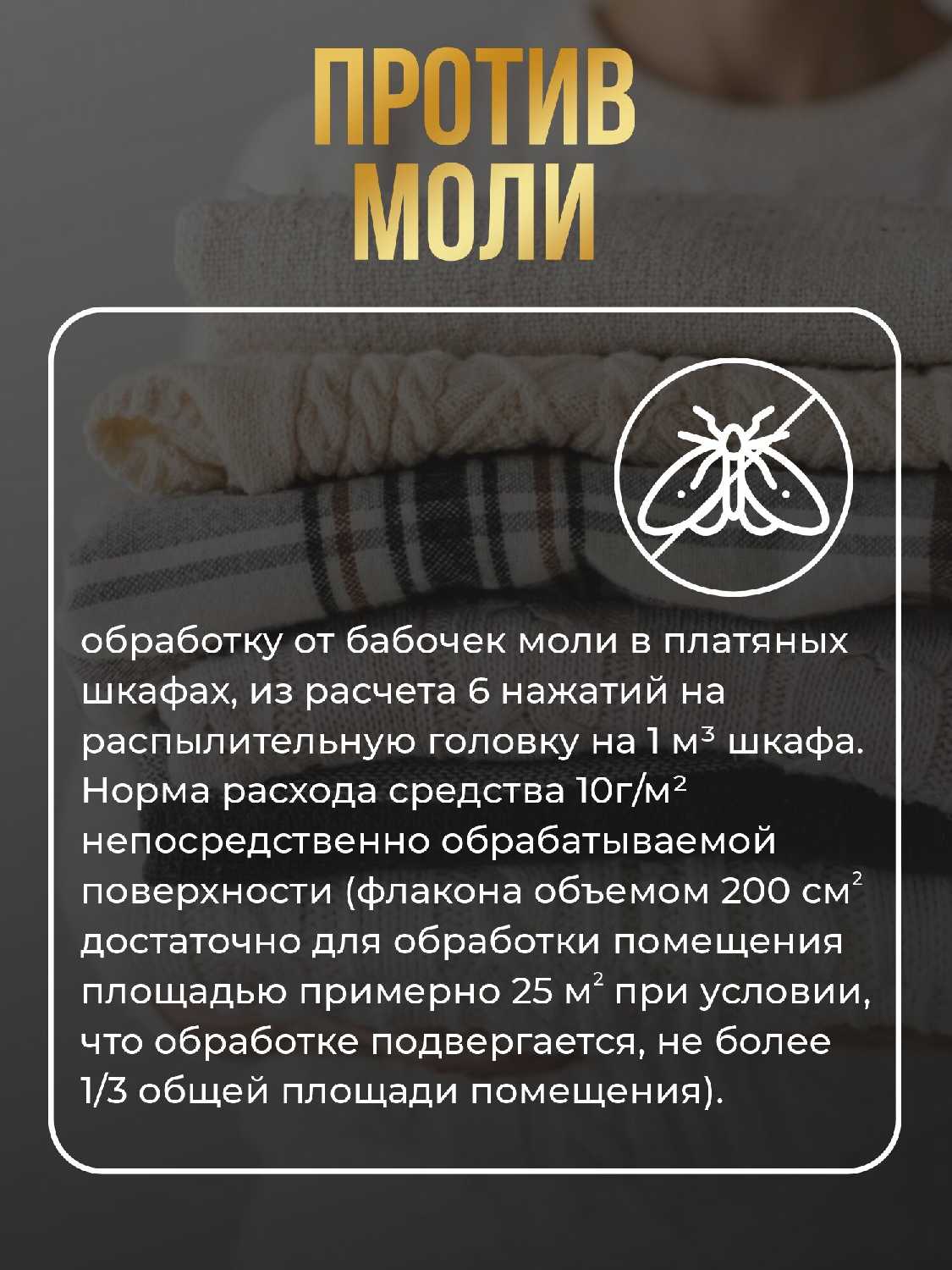 | Способ применения : | Для использования средства от моли нужно следовать инструкциям на этикетке продукта. В целом, обычно применяют следующие шаги: 1. Очистите шкафы и ящики от одежды и других предметов. Протрите их сухой тряпкой, чтобы удалить пыль. 2. Распылите средство на расстоянии 30-40 см от каждой поверхности, которую вы хотите защитить. Обычно достаточно распылить небольшое количество продукта - не нужно перенасыщать поверхности. 3. Дайте средству высохнуть - обычно это занимает несколько часов. 4. После того, как средство высохнет, вы можете вернуть одежду и другие предметы назад в шкафы и ящики. Важно помнить, что средства от моли содержат химические вещества, поэтому перед использованием рекомендуется надеть перчатки и не применять их в закрытых помещениях без хорошей вентиляции. Также обратите внимание на инструкции по безопасности на этикетке продукта. |