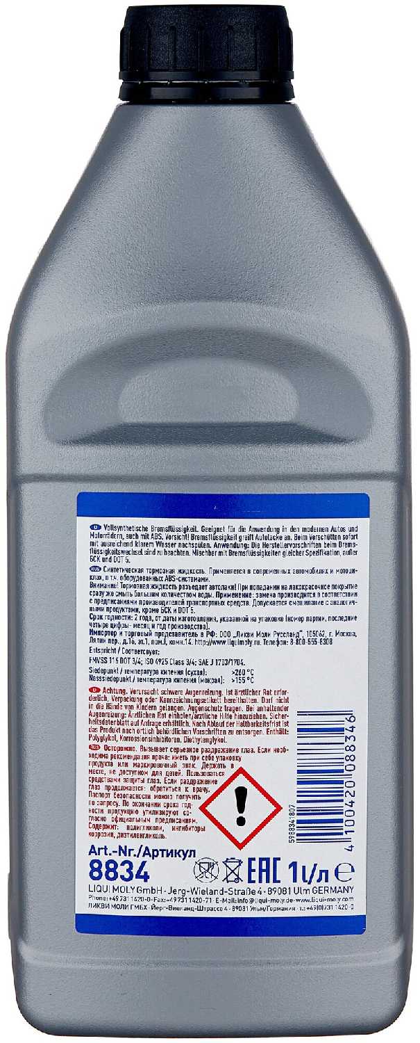 Производство в Германии гарантирует строгий контроль сырья и технологий, что обеспечивает стабильно высокую температуру кипения (от 260°C для "сухой" и от 155°C для "мокрой"). Это подтверждается тестами и многолетним опытом пользователей, которые отмечают отсутствие внезапных отказов. Стандарты включают минимальное содержание воды и чистоту состава, снижая риск образования отложений. Например, нагруженные тормоза в пробках или на трассе работают без сбоев. -
