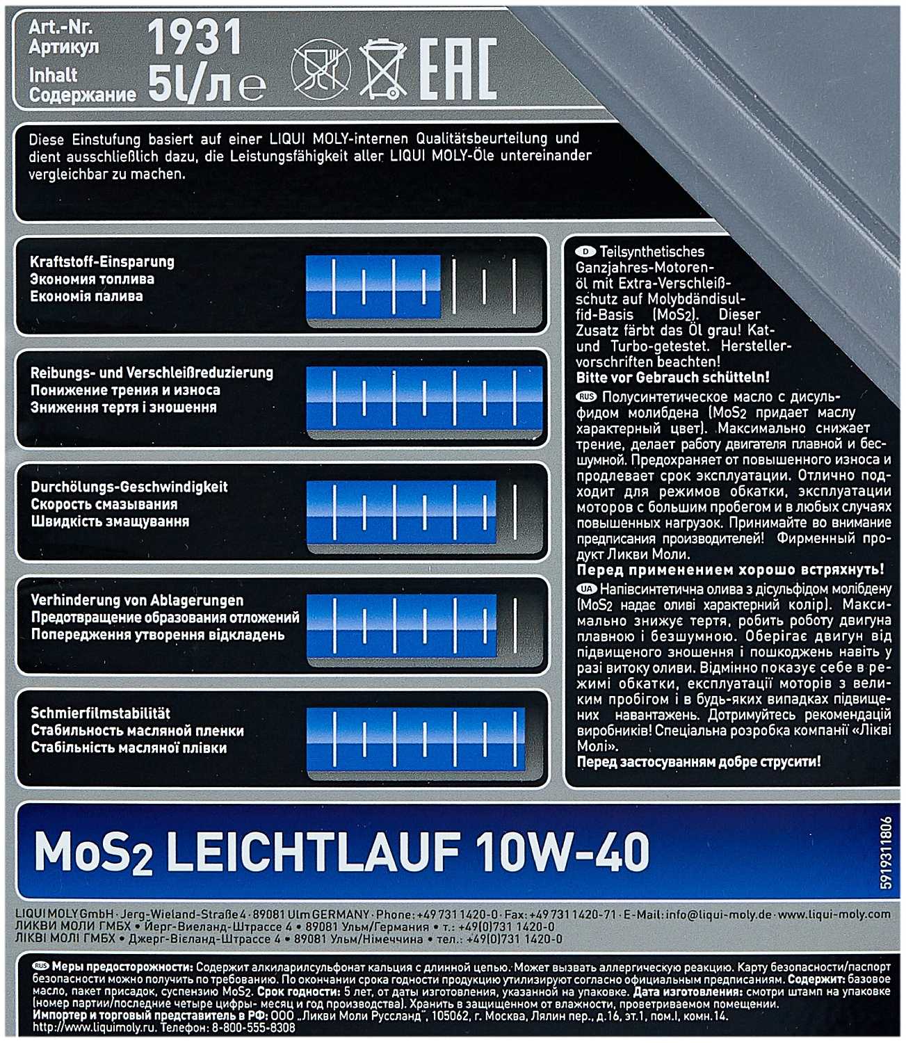 Характеристи LIQUI MOLY MoS2 Leichtlauf 10W-40