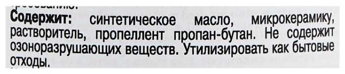 Состав : | синтетическое масло, микрокерамика, растворитель, пропеллент пропан-бутан |