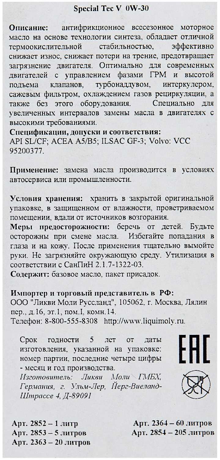 Отзывы о Синтетическое моторное масло LIQUI MOLY Special Tec V 0W-30