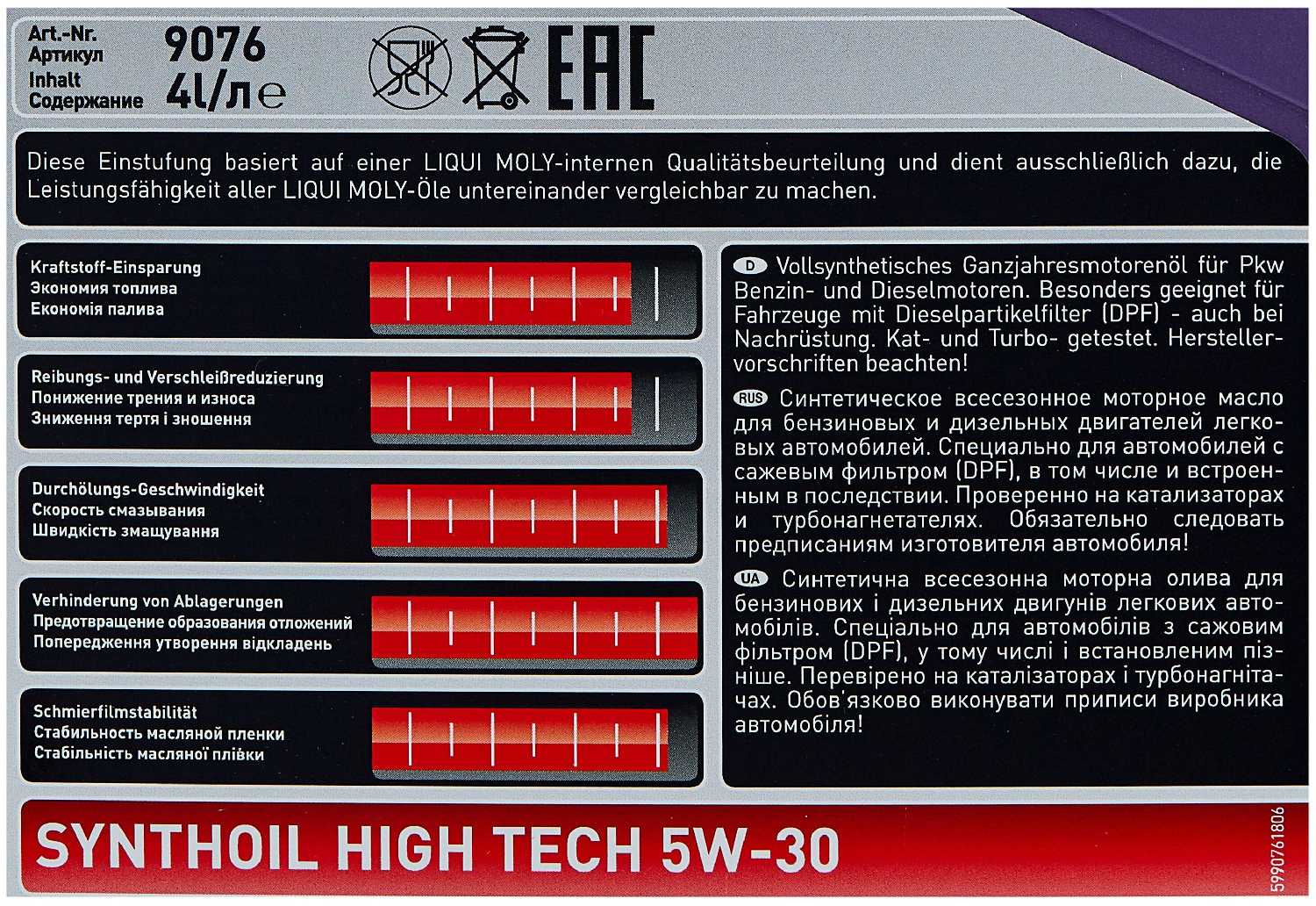 - Не угорает и не требует долива на 7–15 тыс. км, уровень остается на одной метке даже в турбированных двигателях VAG и BMW с пробегом свыше 100 тыс. км.