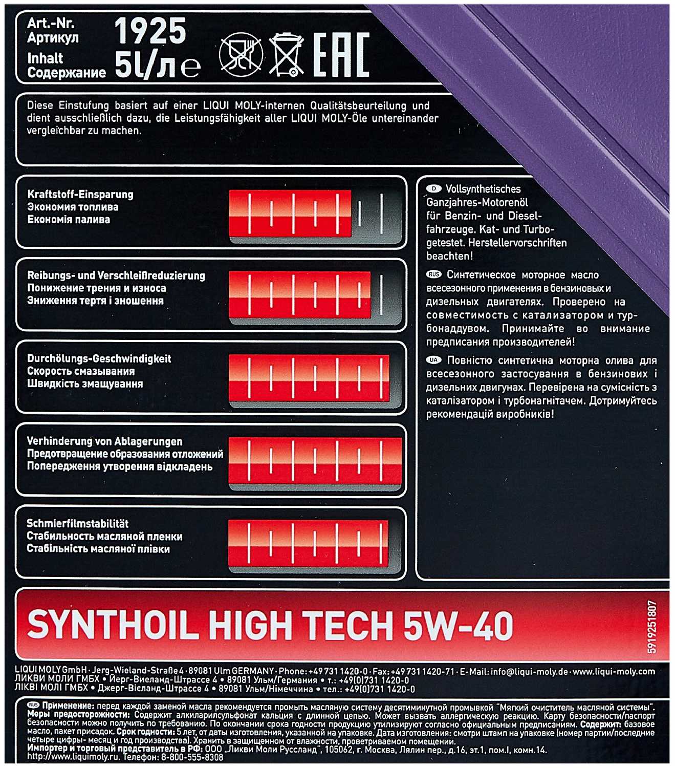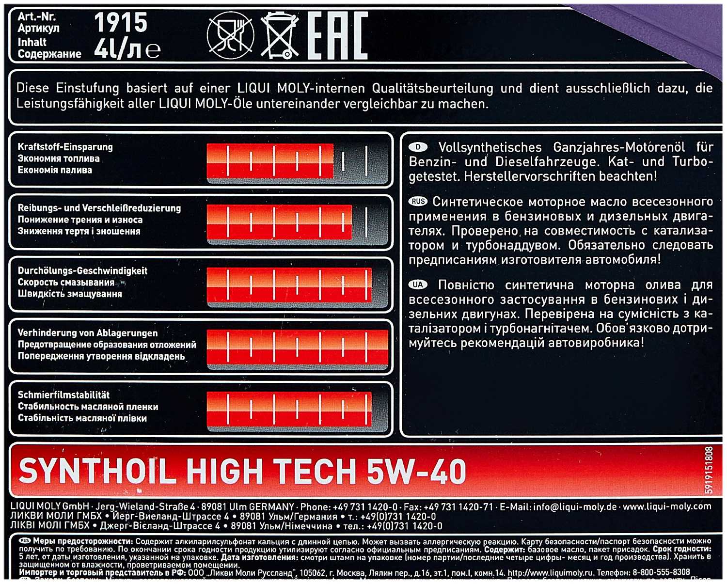 - Производство в Германии, 100% ПАО-синтетика без гидрокрекинга.