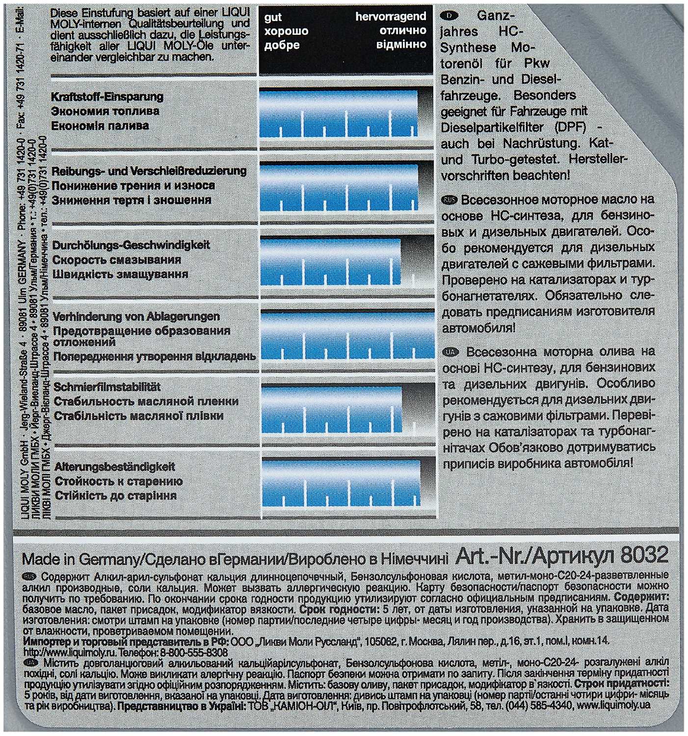 Качественное немецкое масло, формата лонглайф. Масло малозольное, полная синтетика, выдерживает перепады температуры, проверено - от -43 до +40. Меняется каждые 10000 км. Покупаю уже третий год подряд. Синтетика свои показатели держит хорошо. Масложора практически нет. Масло с моющими присадками. Двигатель шуршит мягко, даже на 10000 пробега. Расход топлива на этом масле экономичный, даже на максимальном пробеге перед ТО.