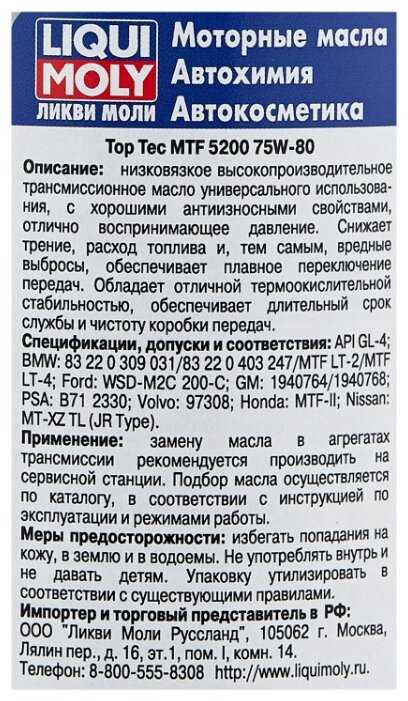 24 отзывов пользователей o LIQUI MOLY Top Tec MTF 5200 75W-80