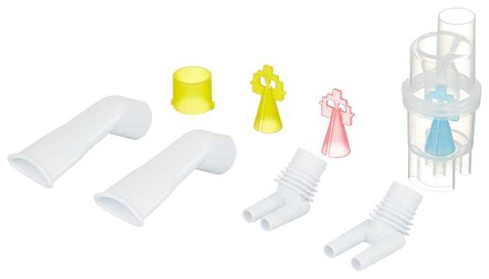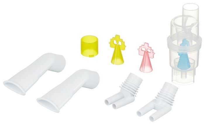 - В комплекте три насадки с разным размером частиц (цветовые маркеры: желтый — мелкие частицы для нижних дыхательных путей, красный — крупные для верхних).
