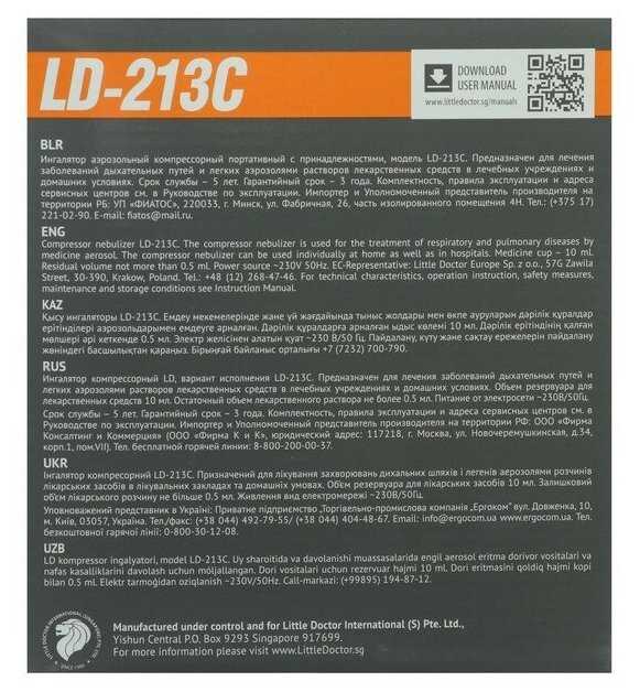 | Подробная комплектация : | компрессор, маска ингаляционная ld-n040, маска ингаляционная ld-n041, мундштук ингаляционный ld-n022 – 2 шт., насадка для носа ld-n058, насадка для носа ld-n059, небулайзер ld-n107 (включая распылитель ингаляционный ld-n008), распылитель ингаляционный ld-n008, трубка ингаляционная ld-n051, фильтры ингаляционные ld-n055 – 5 шт., руководство по эксплуатации, гарантийный талон, сумка |