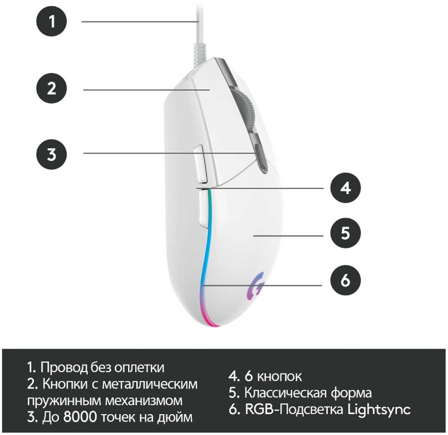 | Дополнительная информация : | 32-разрядный arm микропроцессор, чувствительность настраивается от 200 до 8000 точек на дюйм, RGB-подсветка по технологии Lightsync |