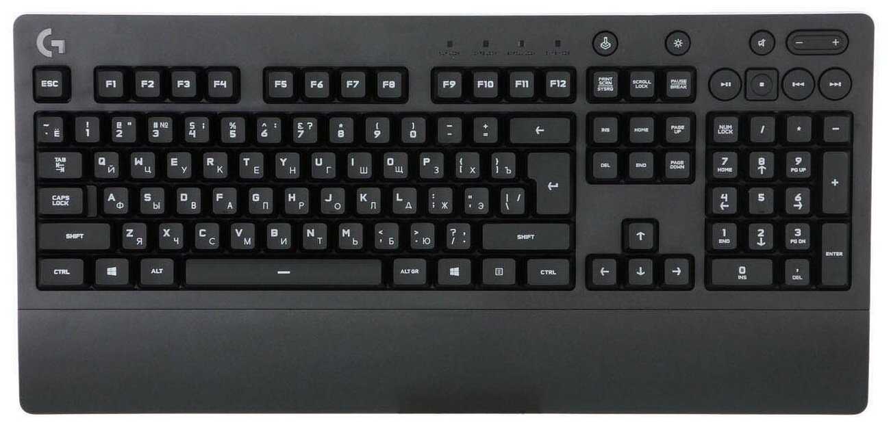 Внешний вид, настраиваемая подсветка через приложение G HUB, подставка под запястья и клавиши для управления музыкой/видео. Можно настроить назначения клавиш