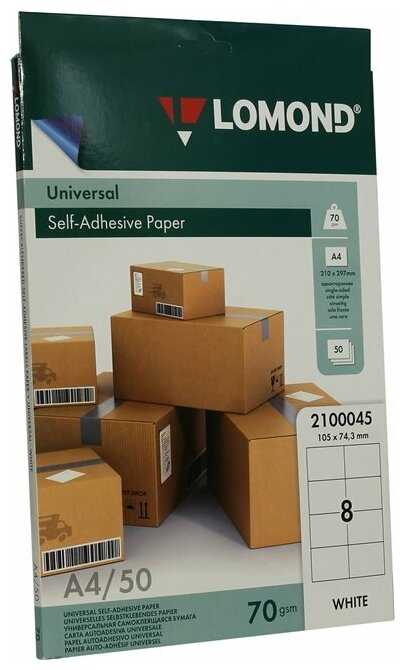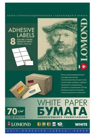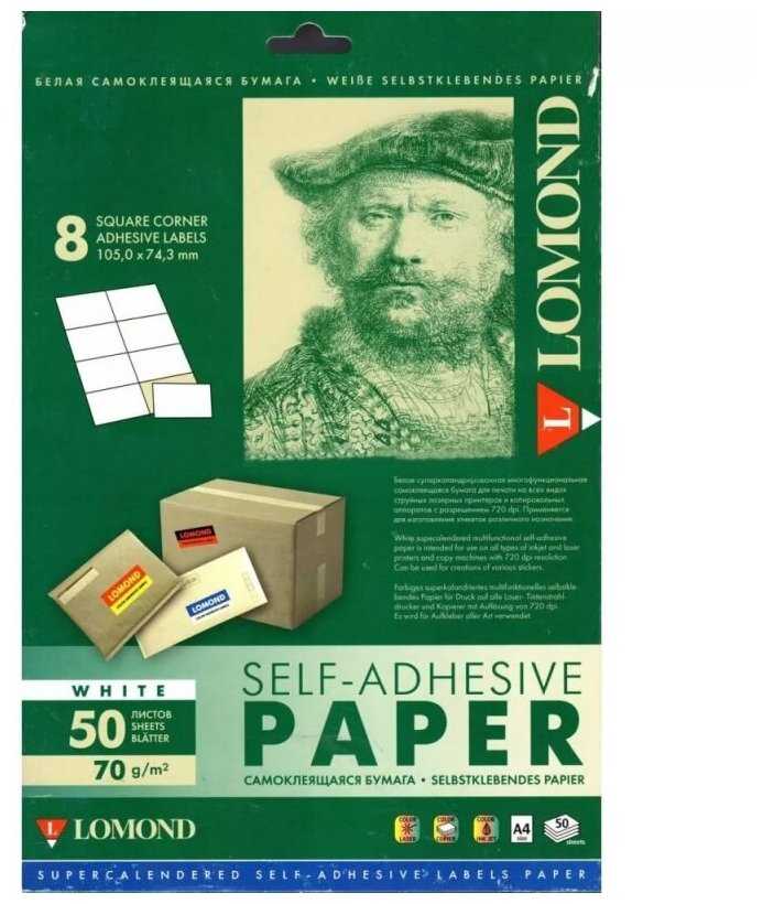 | Дополнительная информация : | Самоклеящаяся бумага формата А4 50 листов, 8 делений на листе (размер этикетки 105, 0х74, 3 мм), максимальное разрешение печати 720 dpi |