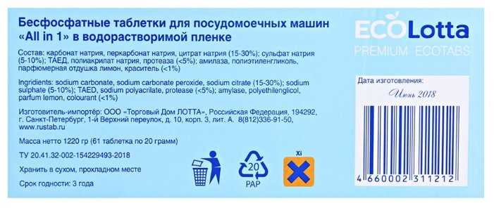 | Подробная комплектация : | ЭКО таблетки для посудомоечной машины ECOLotta |