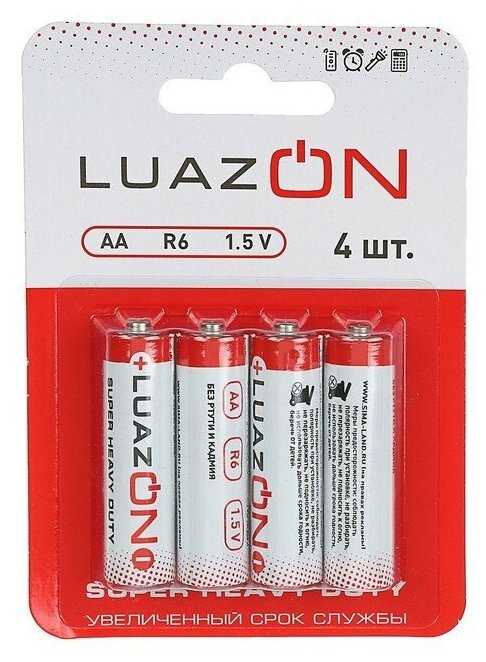 | Дополнительная информация : | Солевые батарейки LuazON Super Heavy Duty, тип AA, подходят для фонариков, игрушек и других устройств, напряжение 1.5V, упаковка блистер на 4 шт. |