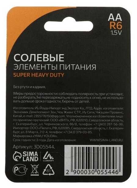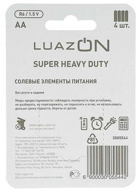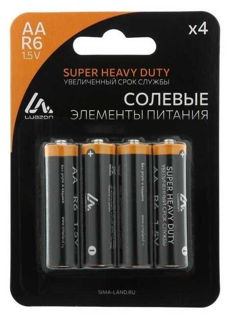 | Дополнительная информация : | Солевые батарейки LuazON Super Heavy Duty, тип AA, подходят для фонариков, игрушек и других устройств, напряжение 1.5V, упаковка блистер на 4 шт. |