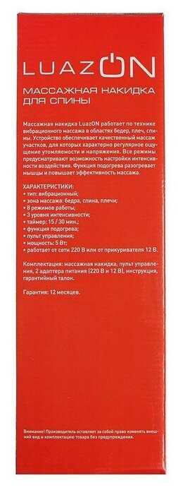 Характеристи LuazON LEM-22, таймер 15/30 мин, 8 видов массажа, 220/12В 3847855