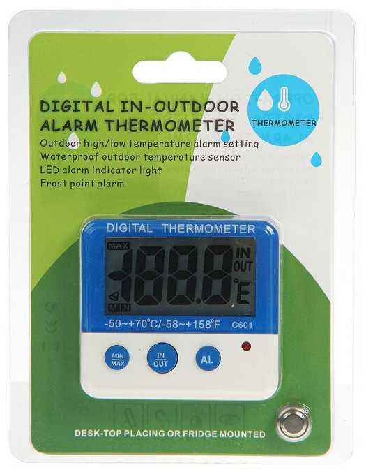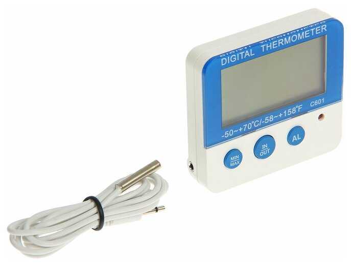 - + Отличный термометр с выносным датчиком. Два датчика для измерения температуры, один "выносной" на проводе 90 см. с разъемом диаметром 5,7мм. (Micro Jack 2,5 мм) , размер самого датчика: диаметр 4мм. длина 20мм., Второй находится в корпусе самого термометра.