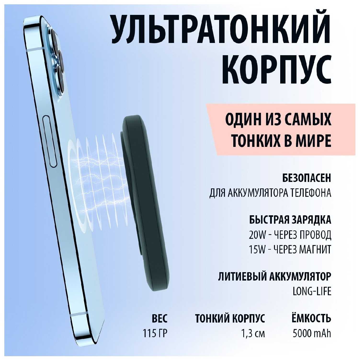 - Тонкий и лёгкий, не выпирает на iPhone 13 mini или Samsung S23, всегда можно взять с собой.