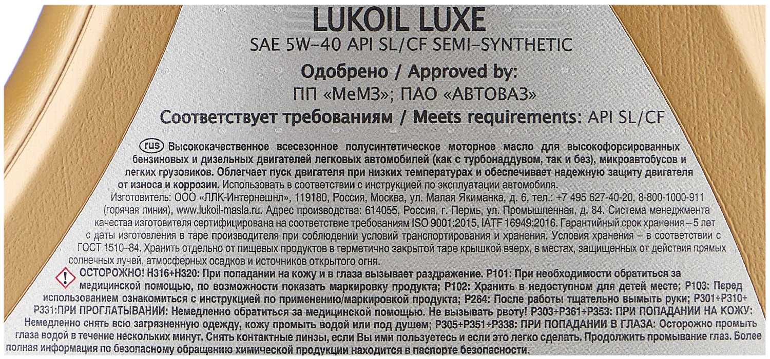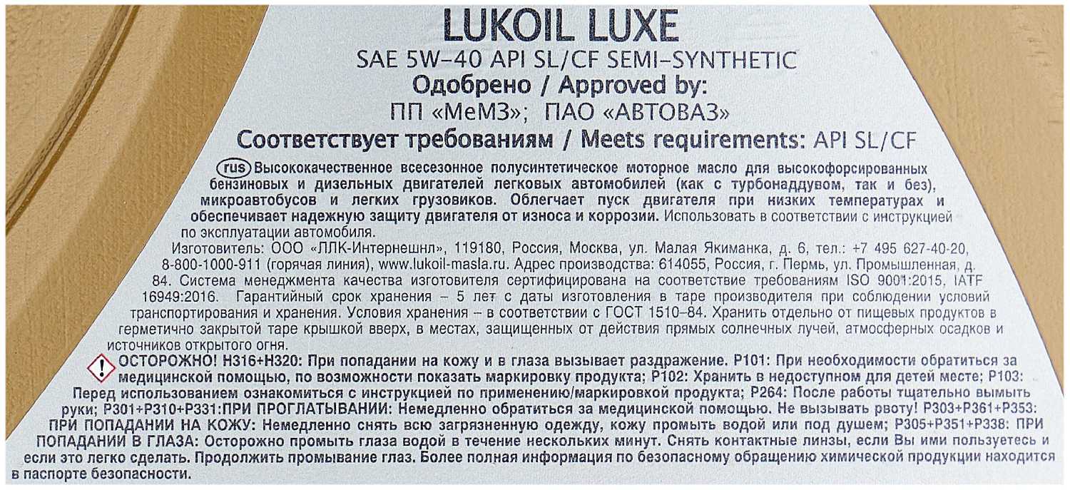 Характеристи ЛУКОЙЛ Люкс полусинтетическое SL/CF 5W-40