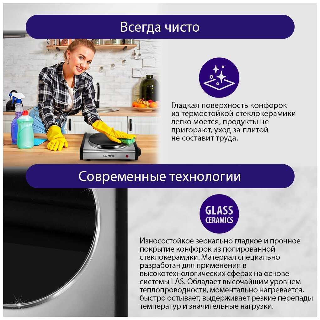 - Гладкая поверхность конфорок и отсутствие труднодоступных мест ("легко чистится") позволяют удалять загрязнения без усилий.