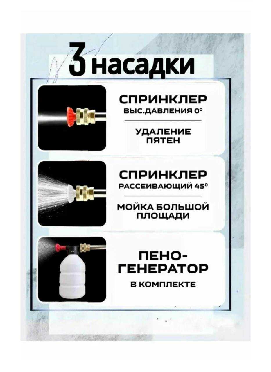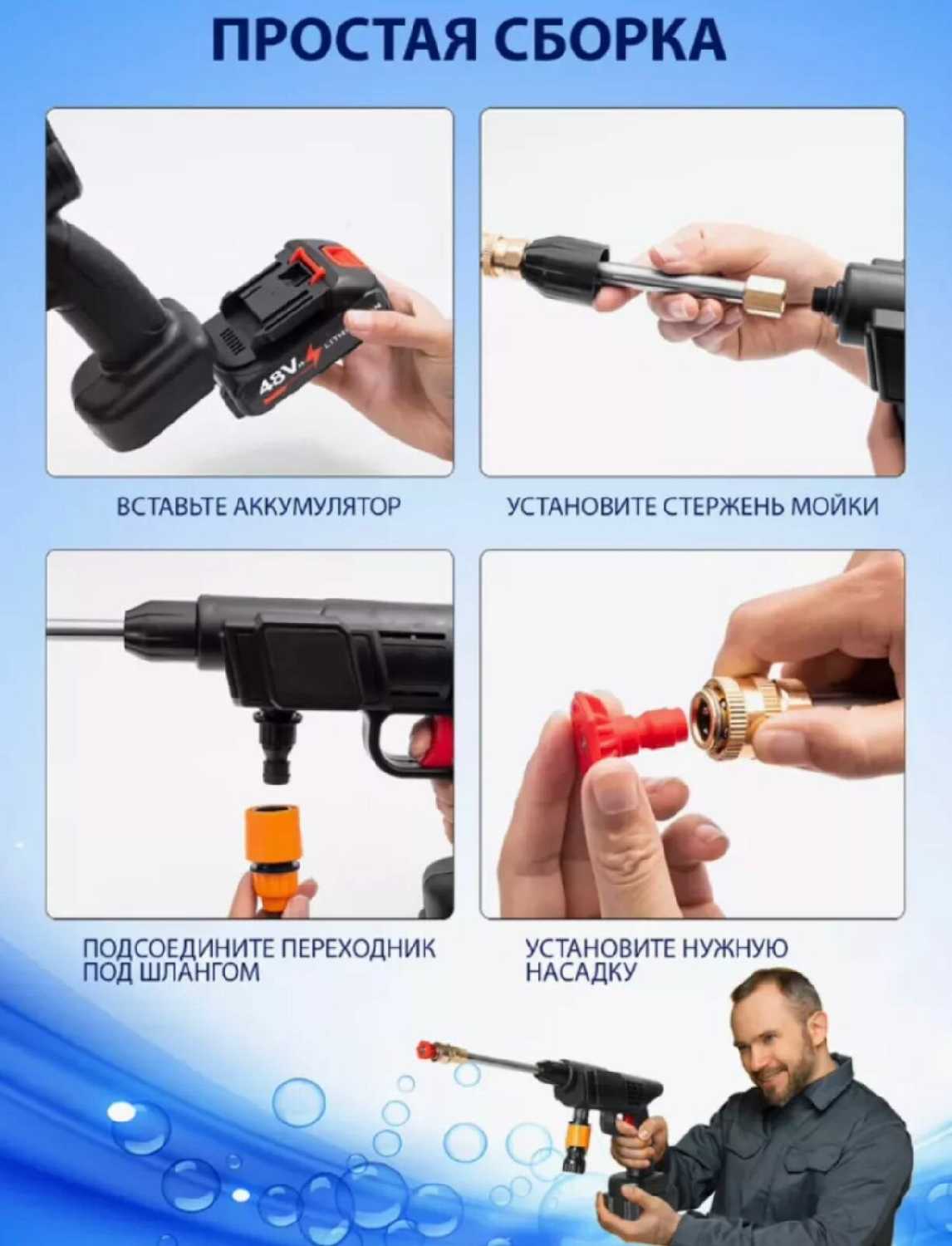 Сборка интуитивно понятна: шланг подсоединяется к помпе и пистолету через быстросъёмы, насадки фиксируются одним движением. Большинство справляется за 2–3 минуты без инструкции (которая часто не на русском языке). -