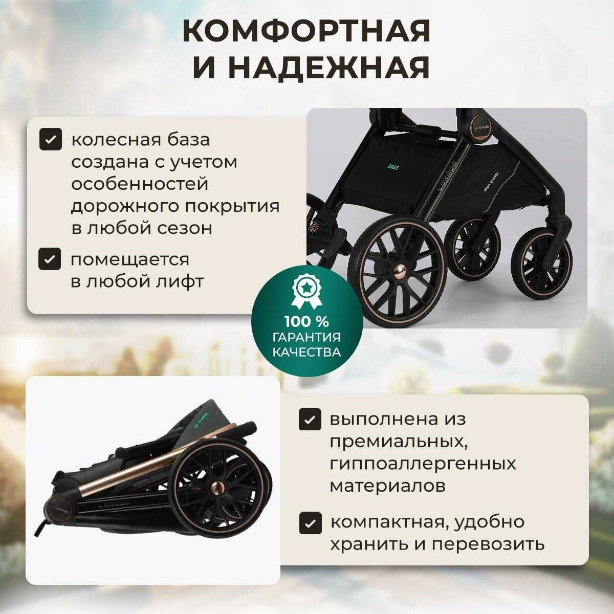 Коляска очень красивая, выглядит дорого, по качеству также не уступает каким то брендовым коляскам. Коляска маневренная, легко управляется и везде проходит, так как не огромных размеров. Пока опробовали люльку и автолюльку, все идеально. Упаковка также хорошая, комплектация полная)