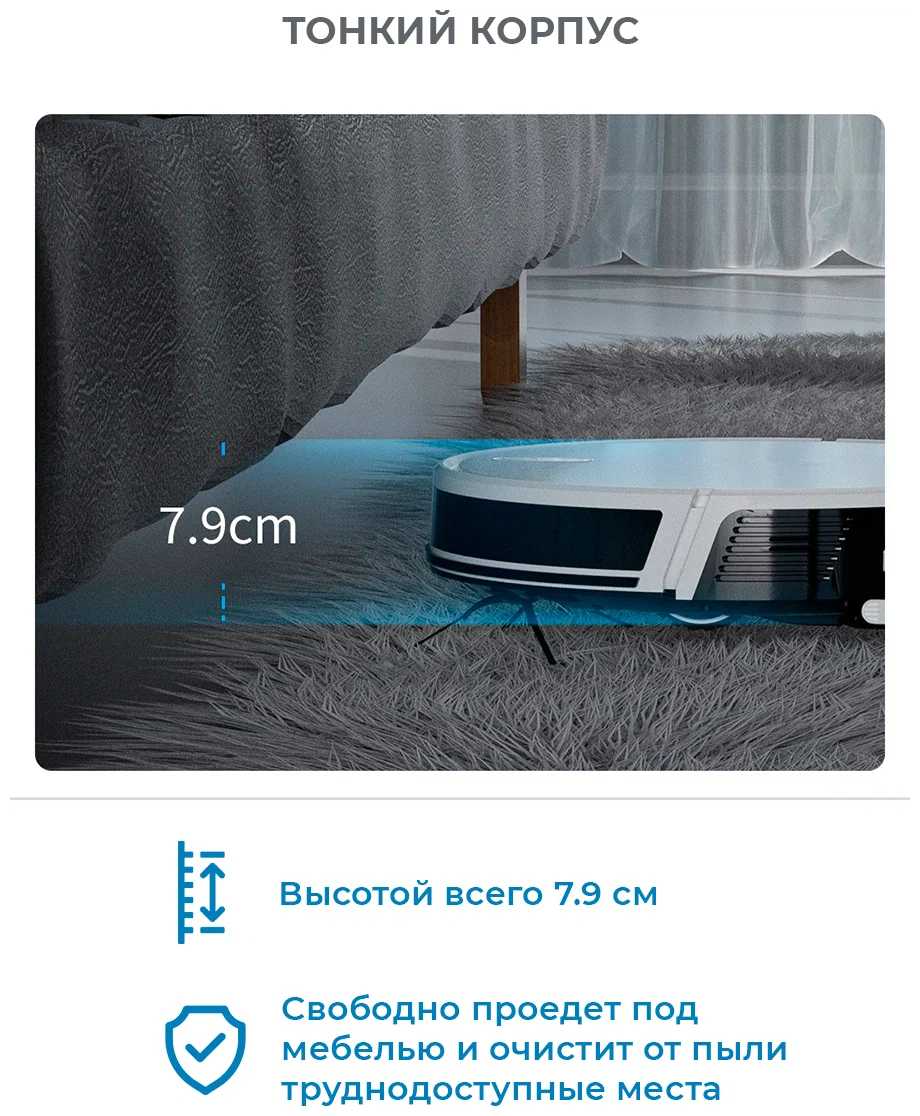 - Клиренс 3.2 см позволяет заезжать под низкую мебель, где скапливается мусор.