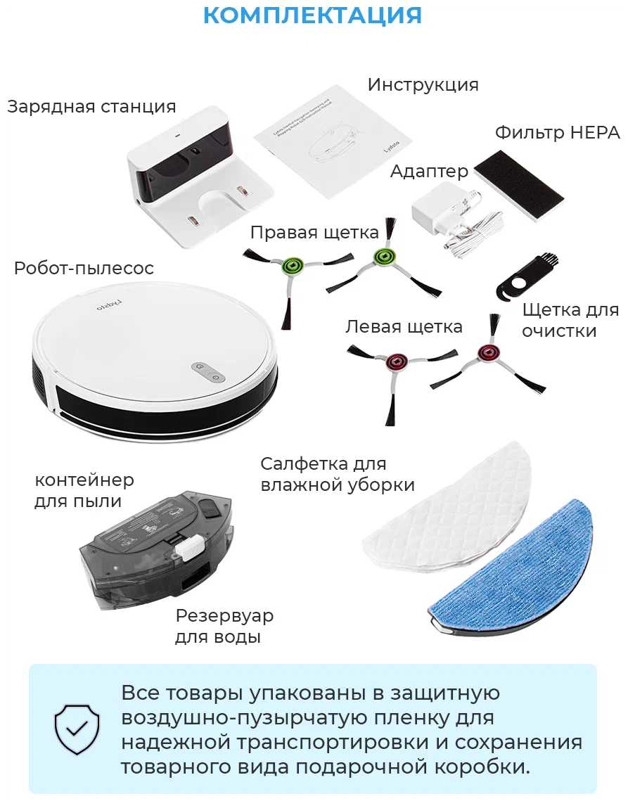 - В набор входят 2 HEPA-фильтра, 4 боковые щётки и 3 сменные тряпки из микрофибры.