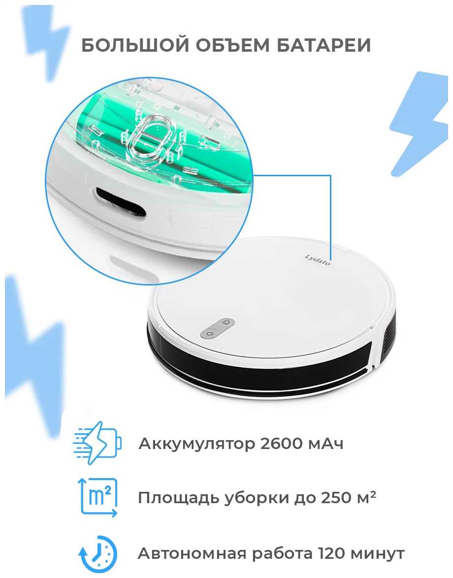 - Аккумулятор 3200 мАч обеспечивает до 120 минут работы в эко-режиме (для квартир до 60 м²).