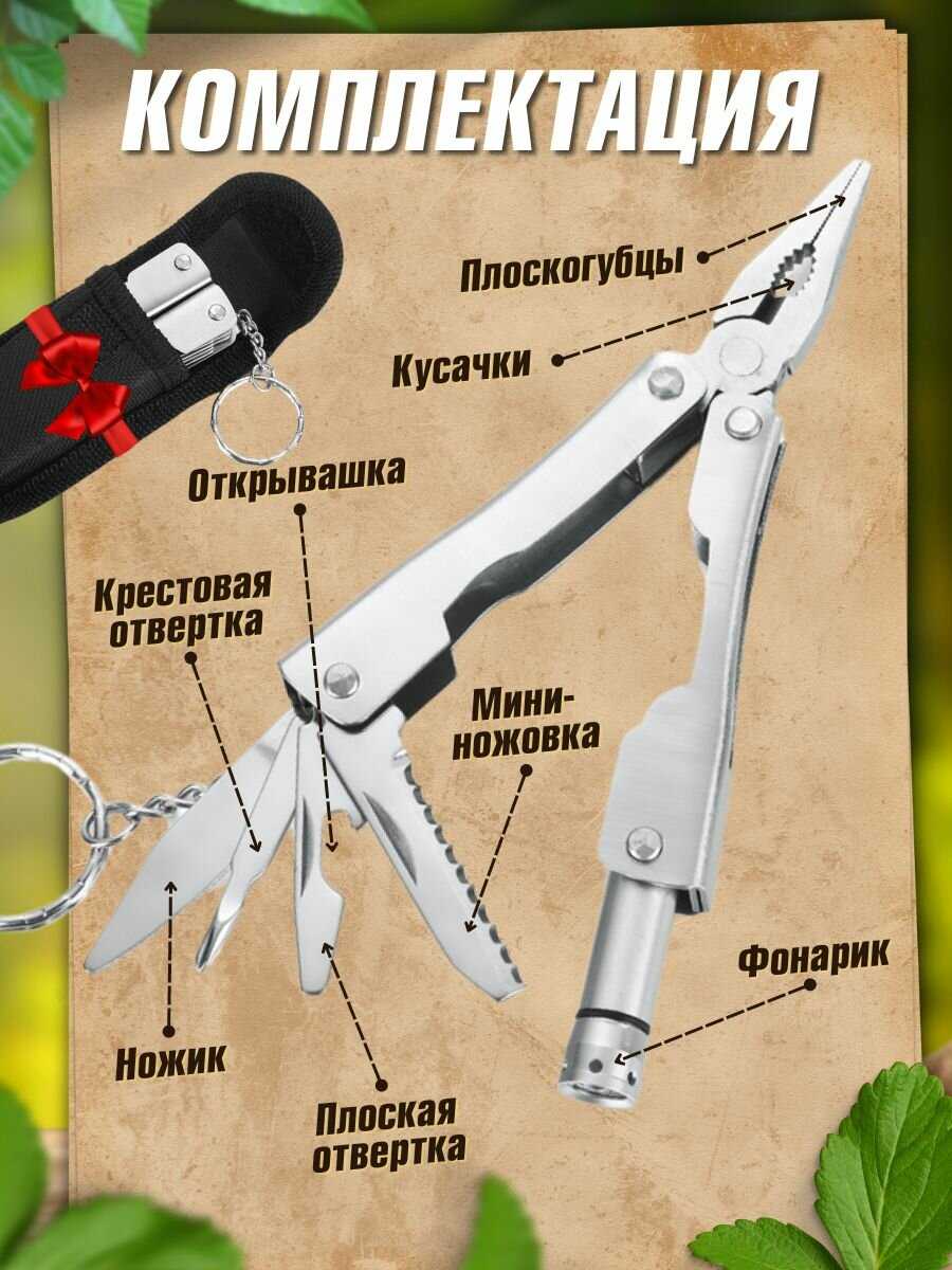 Инструменты (функции) : | кусачки, нож, отвертка, открывалка для бутылок, плоскогубцы, фонарь |